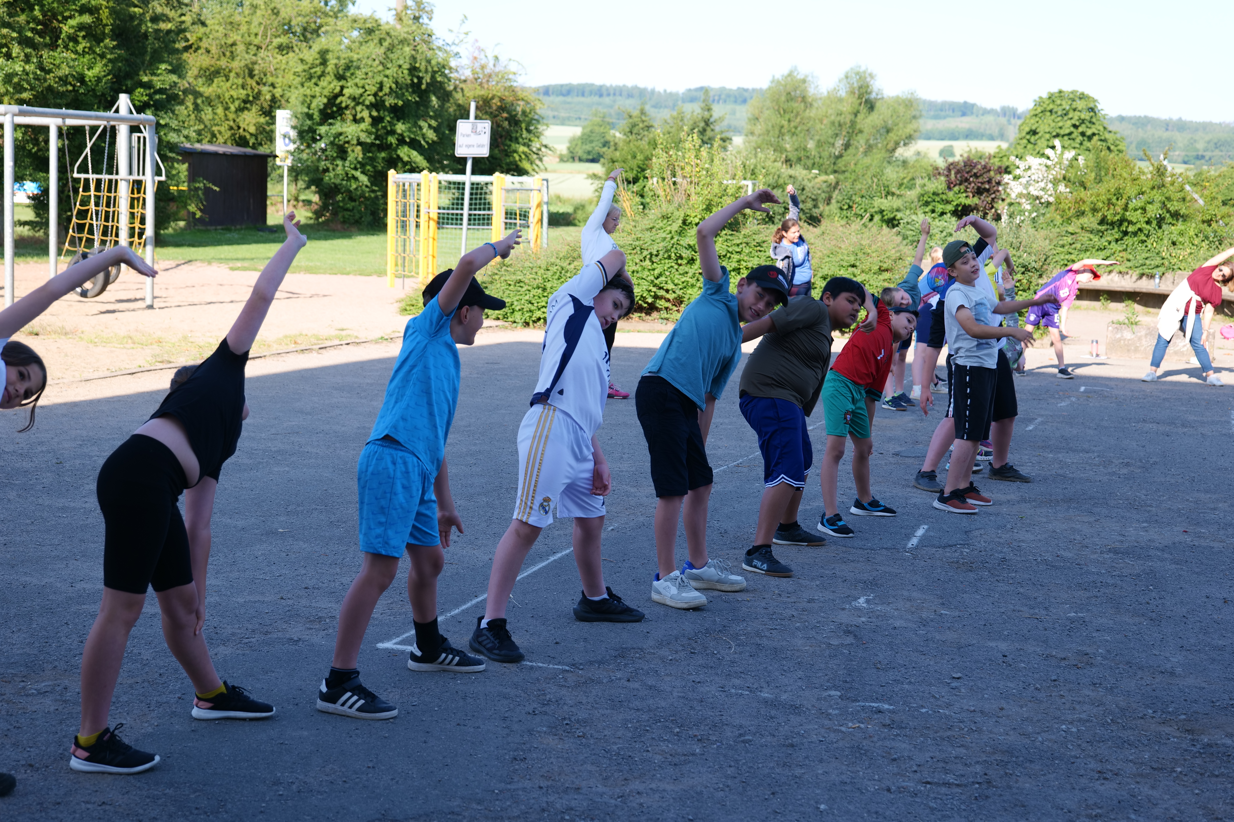 Am Freitag, den 20.06.2025, war es dann von 8.00 bis 12.30 Uhr wieder so weit. Wir versammelten uns auf dem Schulhof, wärmten uns gemeinsam auf, hörten, wie der Ablauf des Tages stattfinden sollte und begaben uns zu den einzelnen Stationen. Es wurde gesprungen in der Weitsprunggrube, gelaufen auf unserer Laufbahn und geworfen auf dem Sportplatz. Wer gerade nicht beim Laufen, Springen und Werfen war, durfte sich auf dem Schulhof an den unterschiedlichen Stationen austoben, die von den Schülerinnen und Schülern unserer Grundschule betreut wurden. Hier konnte man kegeln, Kettcar fahren, Sackhüpfen, Eierlaufen, Dosenwerfen und vieles mehr ausprobieren. Langweilig wurde es Niemandem an diesem Vormittag.