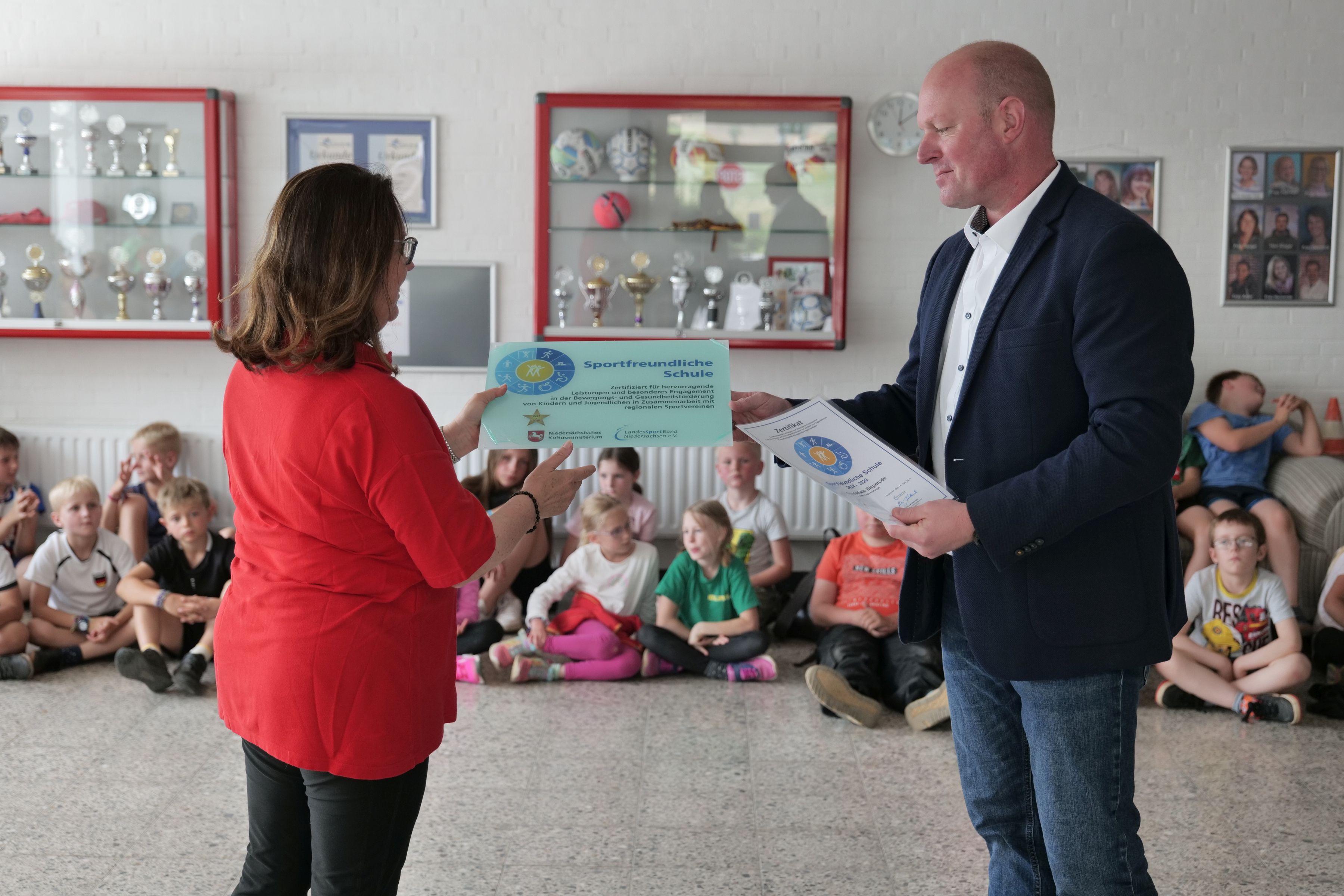 Zum Abschluss unseres Sportfestes kam Herr Wyrwoll, Fachberater für den Schulsport für die Landkreise Holzminden und Hameln-Pyrmont, der uns unsere Landesauszeichnung "Sportfreundliche Schule" überreichte, die wir vor einigen Wochen beantragt hatten.