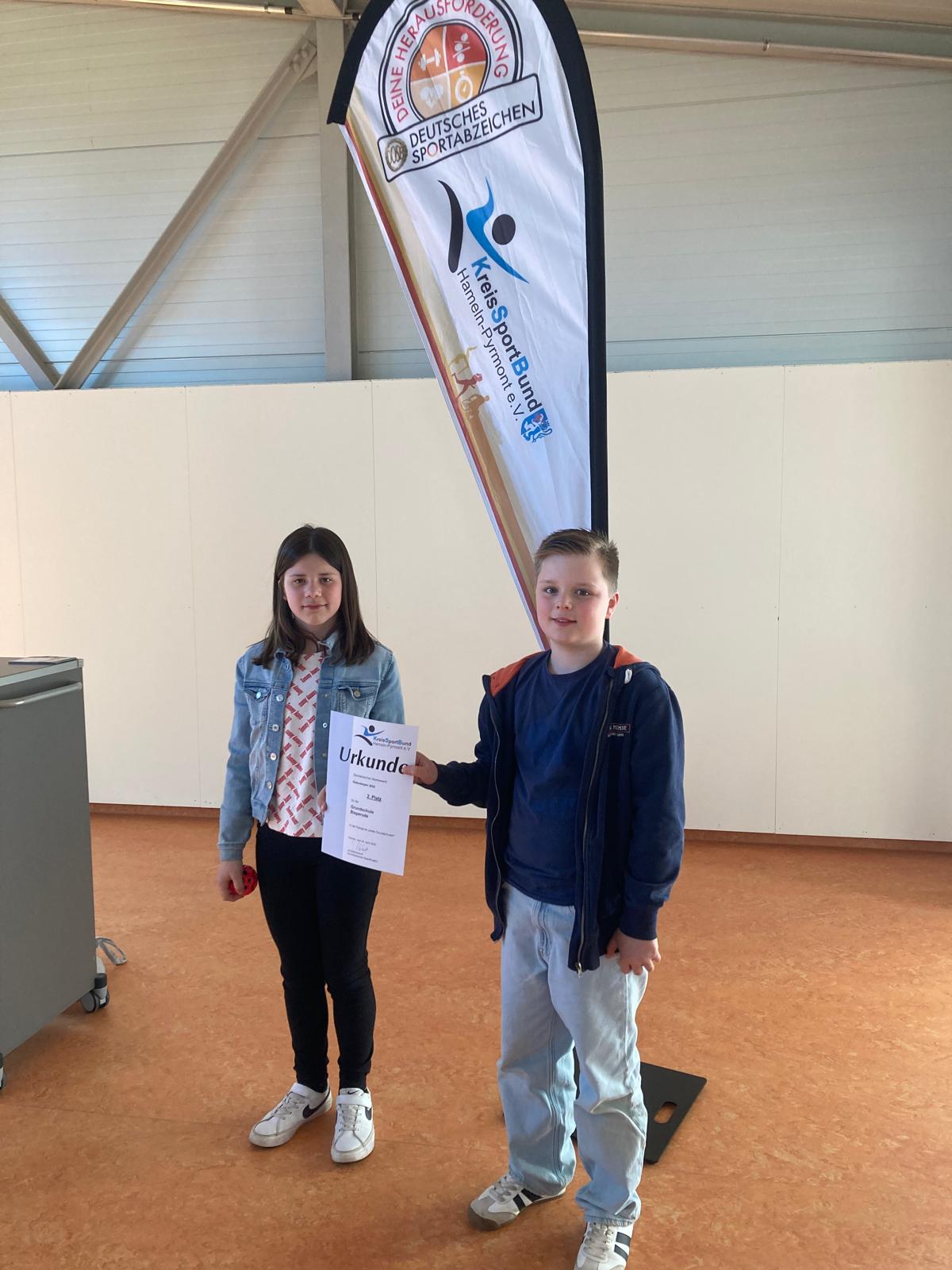 Da staunten unsere Schülersprecherin Mia Lösche (4a) und unser Schülersprecher Hannes Wellmann (3a) nicht schlecht, als sie im Rahmen einer kleinen Feierstunde am 04. April 2025 im Vereinsheim des VFL Hessisch - Oldendorf vom Kreissportbund diese Urkunde entgegennehmen konnten. Durch die Vielzahl der absolvierten Sportabzeichen, die die Schülerinnen und Schüler der Grundschule Bisperode im Rahmen ihres Sportunterríchts im Jahr 2024 abgelegt hatten, wurden sie als Schule mit dem zweiten Platz im Landkreis Hameln - Pyrmont geehrt. Damit verbunden ist ein Geldpreis in Höhe von 90 Euro, der dem Fachbereich Sport zugutekommt. Das ist ein Ansporn, bei dem diesjährigen Sportfest am 20. Juni 2025 wieder das Beste zu geben und damit hoffentlich auch im Folgejahr zu den Siegerschulen im Landkreis zu zählen. Als "Sportfreundliche Schule" wollen wir diesem Anspruch gerecht werden.